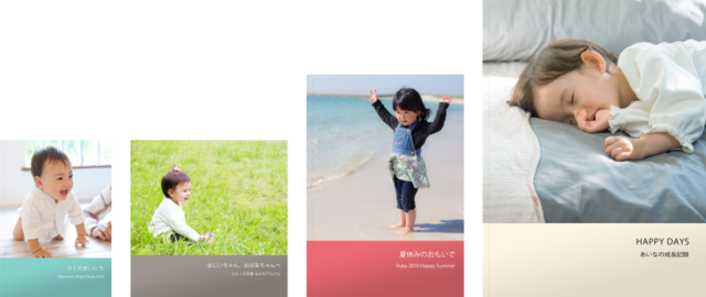 写真が映えるシンプルなデザインのものから、はらぺこあおむしやピカチュウなどの人気のキャラクターのものまで、好みに応じてオリジナルのフォトブックが出来上がります。