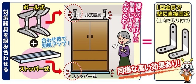 例えば、ストッパー式器具とポール式器具の併用によりL型金具のネジ固定と同様な高い効果が得られます。