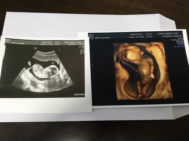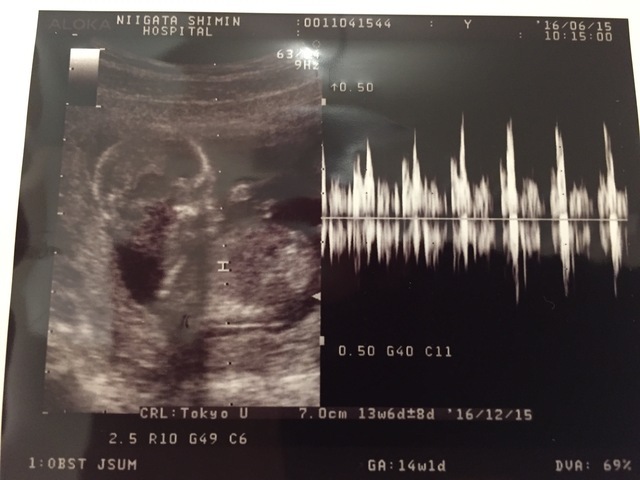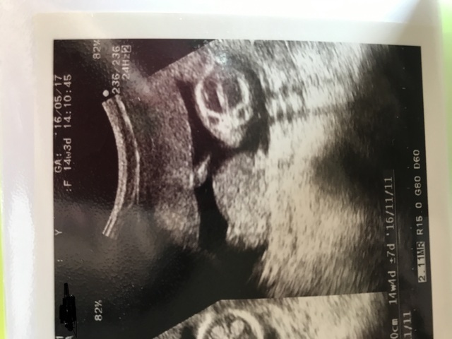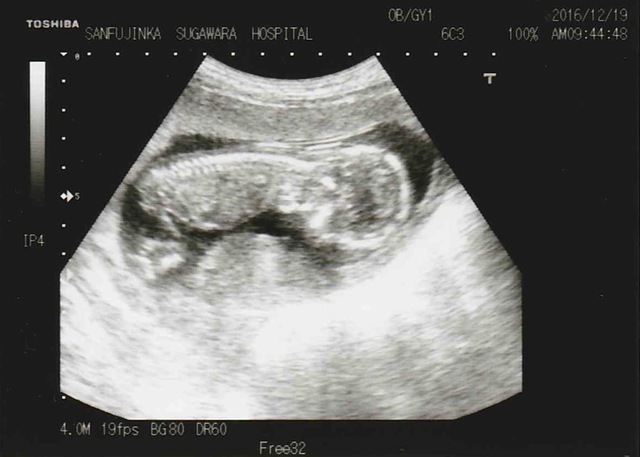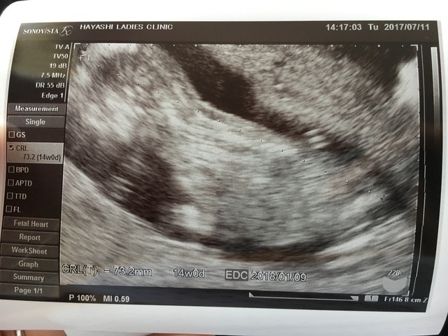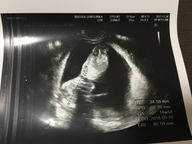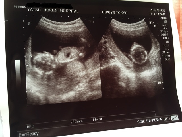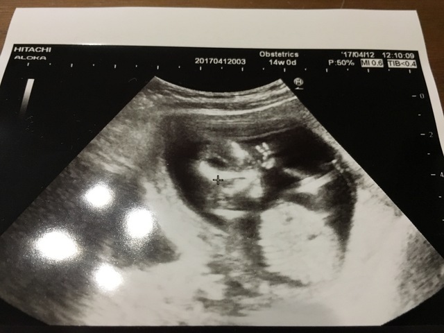 14週目に入り少しずつ悪阻も落ち着いてきてお腹の中で赤ちゃんの成長を感じられるようになってきた頃、妊婦健診で初のエコーを撮ることになり約1ヶ月ぶりにお腹の赤ちゃんに会えるわくわくが!!見てみると前回はまだ人の形には少し遠かったがだいぶ人に近づいていてまだ骸骨のようでしたが、すごく可愛かったです。まだ胎動は感じられませんでしたがお腹の中をぐるぐる動いたりビクンッと動いたりと活発で先生からは「よく動く子だねー!!」と言ってもらえて元気に成長してる姿が見られて嬉しかったです!!