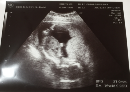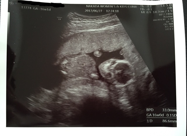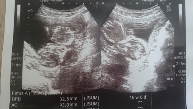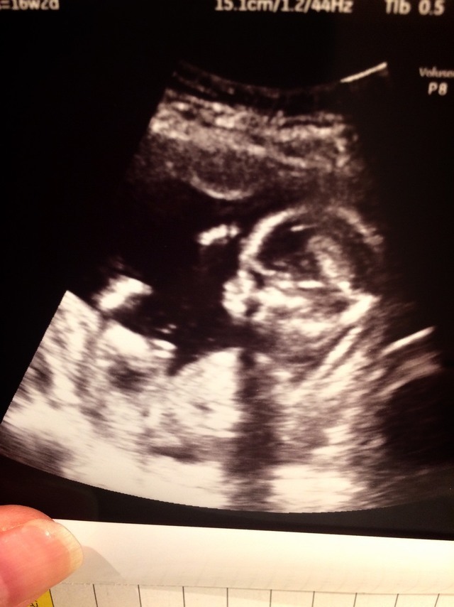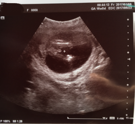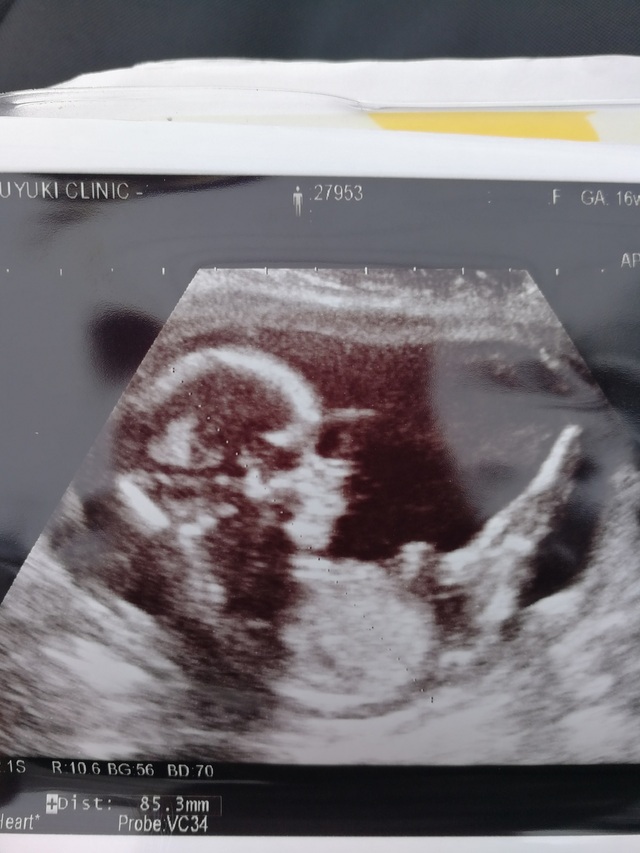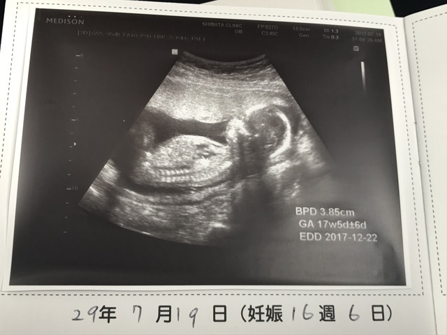 16週3日の写真です。前回の健診から4週ぶりの写真でしたが、すごく赤ちゃんが大きくなっていてくれました!もう性別もわかるようでしたが、足が閉じていてわからなくて、少し残念でした。性別がわかれば、色々肌着などのベビーグッズを購入できるのに、もうすこし先まで我慢しておきます!次の健診も4週後!すごく楽しみです!!