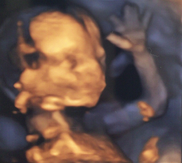 はじめて4Dで見せてもらった時です。手を挙げて、ハーイって言ってるみたいです。まだ16週なのに、こんなにパーツがはっきりしてるんだと驚きました。