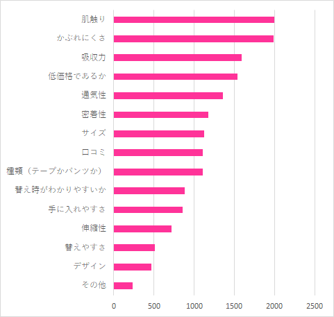 次いで多かったのが、「吸収力」「低価格であるか」という回答でした。赤ちゃんは夜中もおむつ替えをすることが多いので、漏れにくいおむつを選びたい、枚数が多く低価格のものを選びたいと考えるママパパが多いようです。