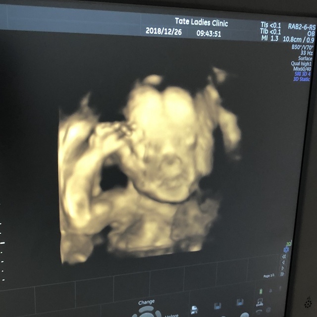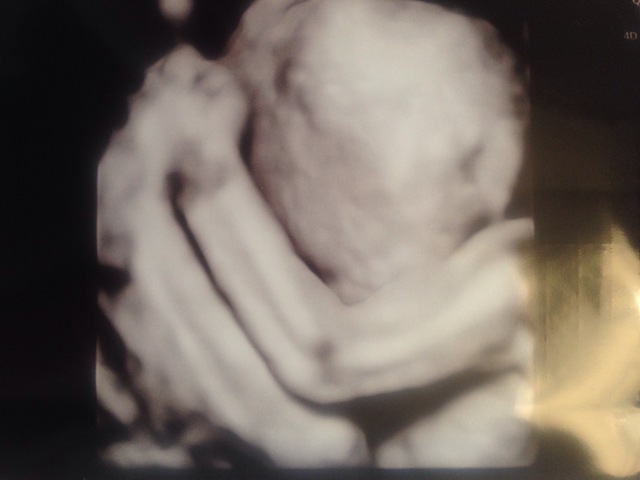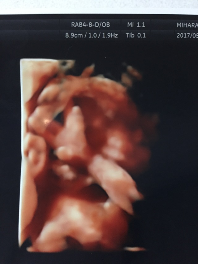 つわりが長く続いたので、やっと落ち着いたころのエコー写真です。パパと上の子と一緒に検診に行った時だったのですが、せっかくの4Dエコーなのに、何度やってもお顔を見せてくれませんでした。恥ずかしがってるのか、ずっと両手で隠したまんまでした。それはそれで面白かったです。