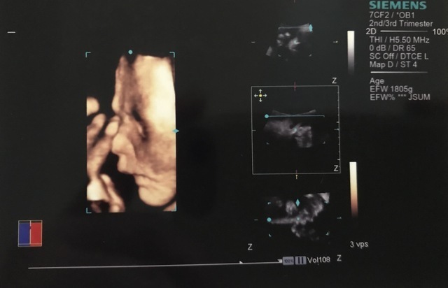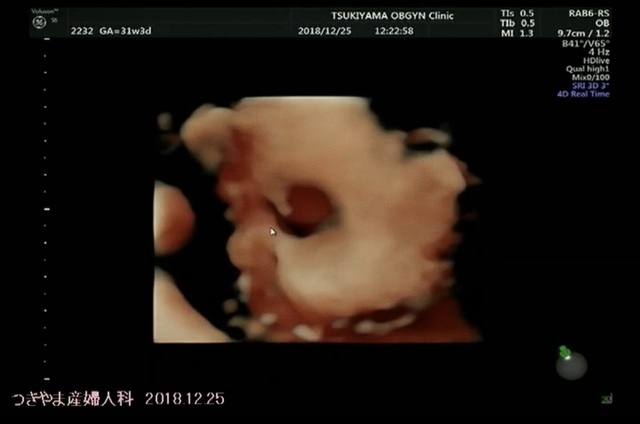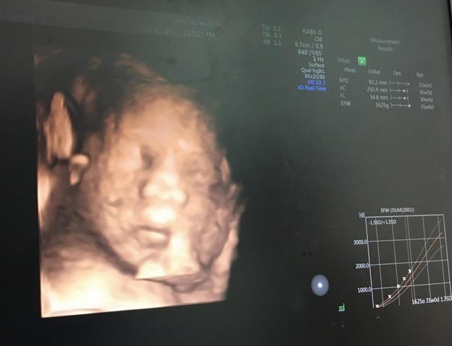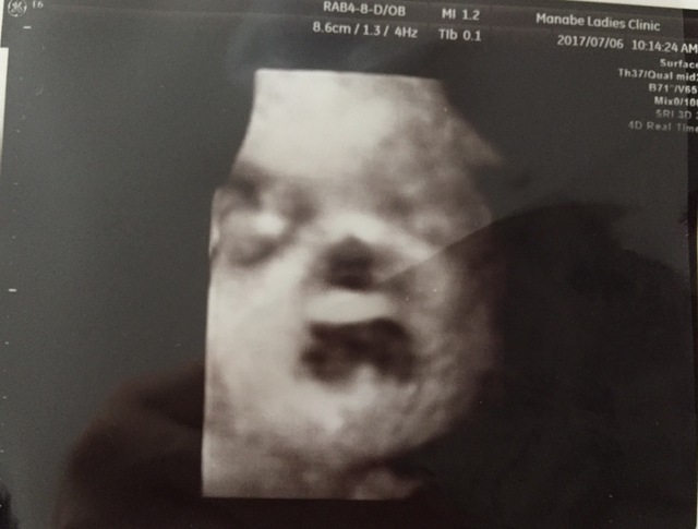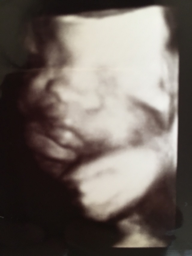 私の通っていたクリニックでは、20週以降、4Dエコーを撮ってもらえました。毎回うずくまってガッツポーズだったため、性別が確定したのも30週を超えてから。これは、ようやく顔が撮れた時の奇跡の一枚です。鼻と口元が旦那そっくり!