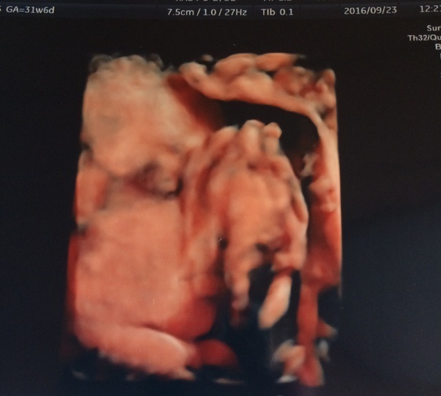 初めて4Dのエコーを撮ってもらった時のものです。せっかくの4Dエコーなのにお顔を隠してしまっているベビーさん。
