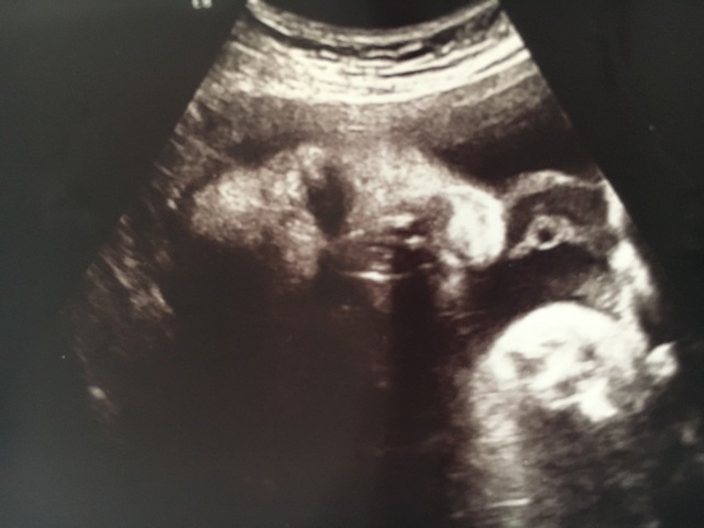 子宮に顔を押し付けて鼻ぺちゃです。3人目の妊娠ですが、何度見てもエコー写真はワクワクします。しかし、今回の子はなかなかいい顔を見せてくれなくて、どんな顔をしているのかとても楽しみです。妹が欲しいと言っていたお姉ちゃんも楽しみにしてくれています。