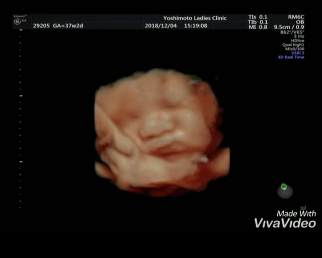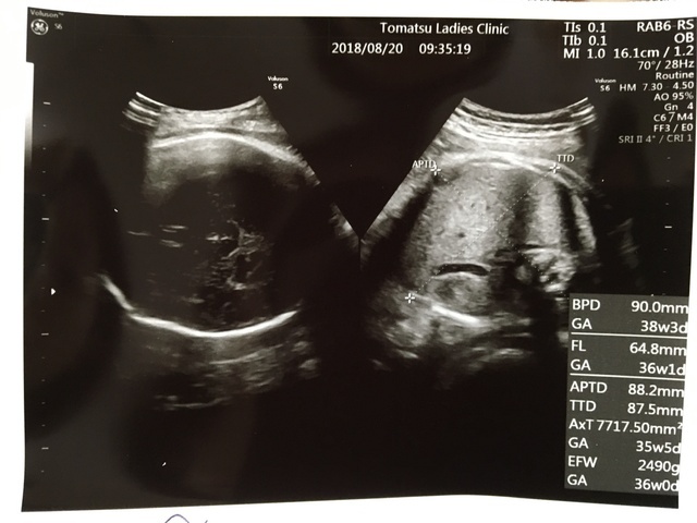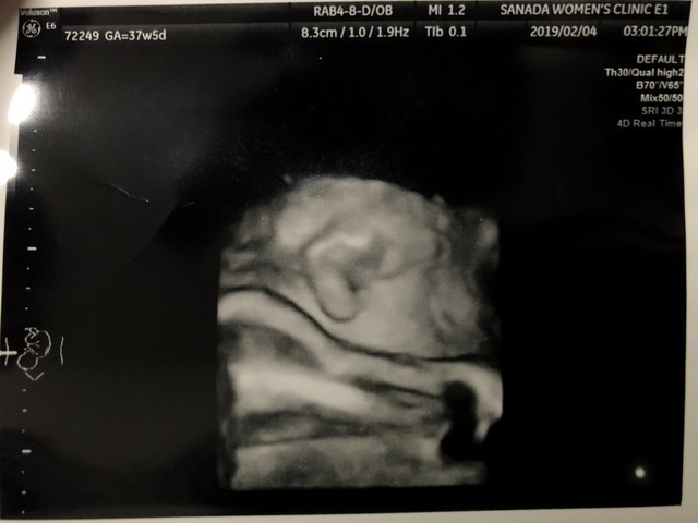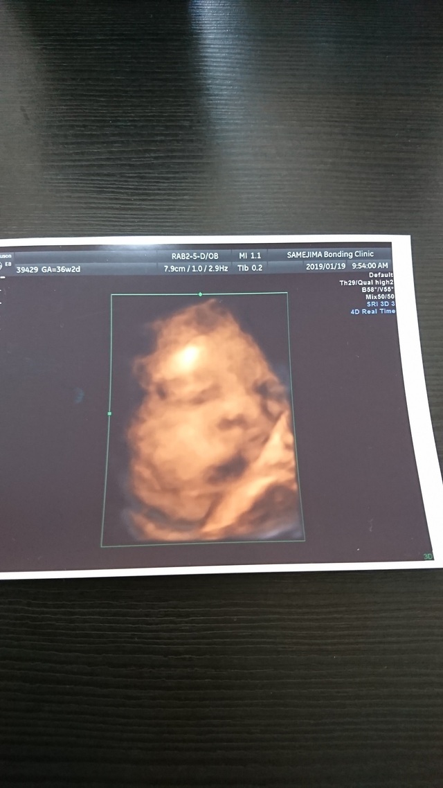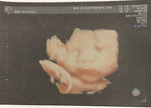 臨月に入ってお腹が重くて何をするのも大変でした。でもお腹の中で元気に暴れまわってるのを感じると、痛みよりももうすぐ会えるんだなーとか胎動を感じられるのもあと少しなんだなーとわくわくして毎日を過ごしていました。この時のエコー写真で初めて正面の顔を見ることができて、パパとあまりにもそっくりだったので両家の家族や共通の友達と大笑いしたのを覚えています。この時点で推定体重が3200gになっていて、初めての出産でこんなに大きい子を無事に普通分娩で産めるのか不安でしたし、体を動かすのは大変な時期でしたが家族に支えられて楽しく毎日を過ごしていました。