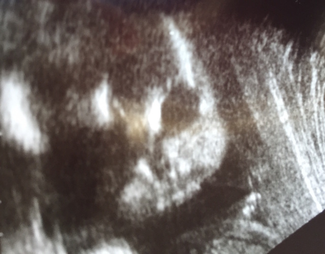 いつもエコー写真では、お顔はなかなか見せてくれず、先生からも、「毎回残念だね」と言われ続けていたのですが、この週だけは、腕とお手手で顔をかくしてしまっているけれど、少し見せてくれました!ぷっくりしたほっぺが可愛らしくて愛おしい一枚です!恥ずかしがり屋さんの我が子のほのぼのエコー写真でした!!