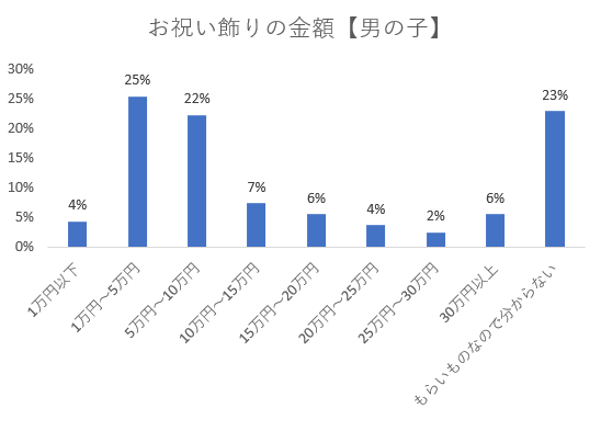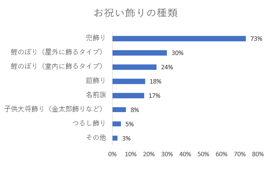 こちらは屋外、室内ともに2、3割が飾りの種類として回答。以下、ゴージャスでとても見栄えがする鎧飾り、我が子カスタム感が強い名前旗、金太郎飾りのような子ども大将飾り、つるし飾りと続きます。
