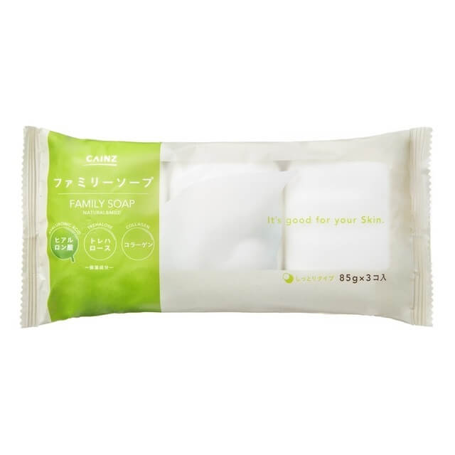 出典:www.cainz.comシンプルな包装の石鹸は、3個で98円とコスパも抜群です。うるおい成分のグリコシルトレハロース、コラーゲン、ヒアルロン酸が配合されています。フローラルの香りの石鹸です。