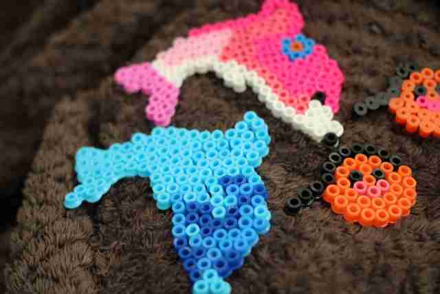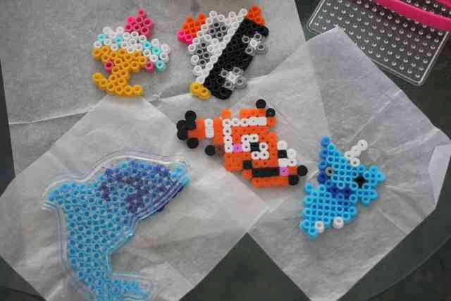 左上から、パフェ、パトカー、ニモ、恐竜です。左下はモチーフボードなので、ボードにそのままビーズを並べる「だけ」。こちらは娘が1人で完成させることができました。