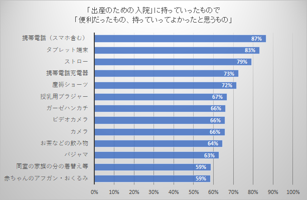 ちなみに「役に立ったもの」11位以降は母乳パッド(57%)退院時のママの洋服や靴(55%)チャイルドシート(55%)イヤホン(55%)母子手帳(53%)時計(52%)スリッパ・サンダル(52%)ティッシュ(51%)ハンドタオル(51%)と続いていました。