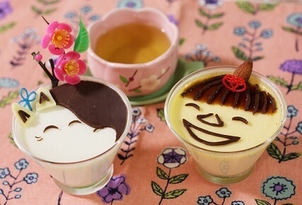 容器の形を活かして作るミイとムーミンのひな祭りプリンです。