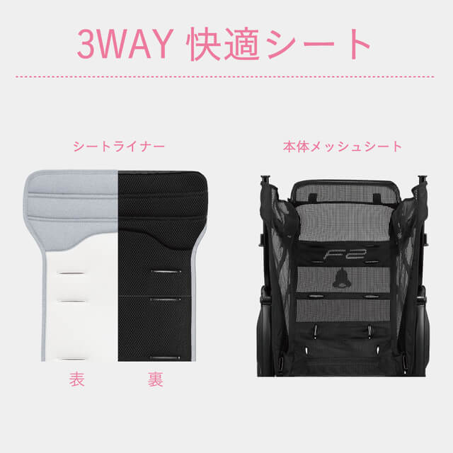 シートライナーはリバーシブルで表裏の両面が使えるようになっています。さらにシートを外せば本体もメッシュシートとして涼しく使える3WAY。