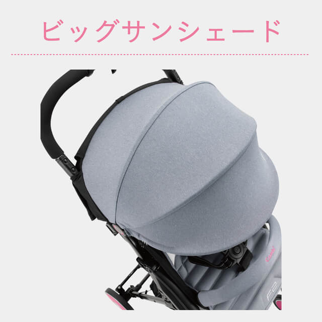 「F2plus」は、お子さんの頭をすっぽり覆ってくれるビッグサンシェード。