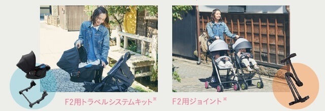 さらに、F2用トラベルシステムキット(別売)※と合わせて使えば、新生児から使えるベビーカーやチャイルドシートとしても使用可能なので、1台目のベビーカーとしてもおすすめ!