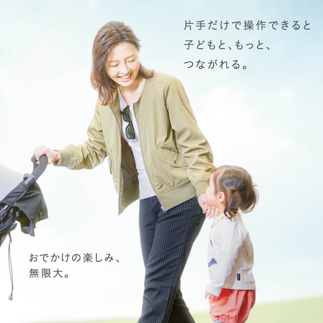 片手で簡単に操作ができる「F2plus」なら、遊び盛りのお子さんといつでも手をつないでおでかけできます!