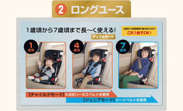 1歳~4歳ごろまでは5点式のハーネスベルトでしっかりと、体をホールド。3歳~7歳ごろにかけては、シートベルトを利用した形での利用にシフト。