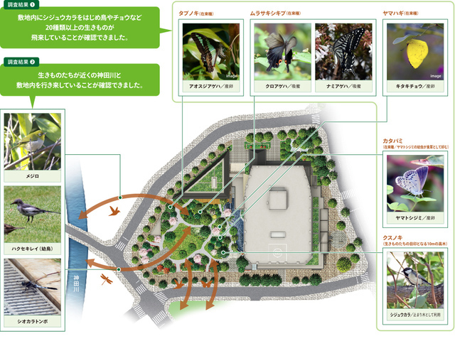 森の生き物の飛来状況を調査してみると、鳥や蝶などが20種類以上集まってきていることが確認されました。ザ・パークハウスが鳥や蝶の中継地になり、周囲の緑や公園との間を行き来するようになっているんです。