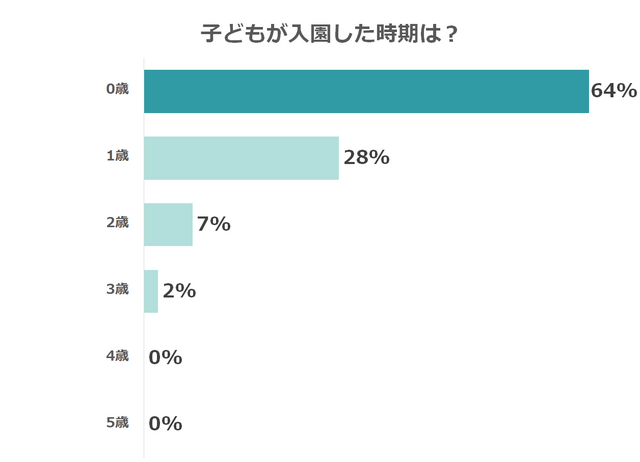 コズレ会員に行った保活についての調査で、お子さんが入園した年齢を聞いてみました。結果は、0歳入園が64%、1歳入園が28%、2歳が7%。