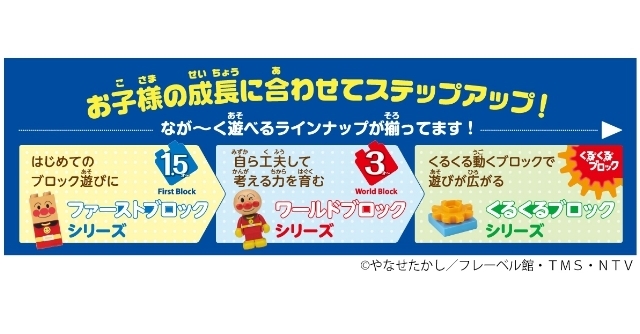 出典:anpanman.bandai.co.jpはじめてのブロック遊びをはじめる1.5歳前後。それから2歳、3歳以降と自ら工夫して考える力を育む段階にいたるまで、年齢に合わせた商品がたくさん揃っています。