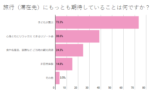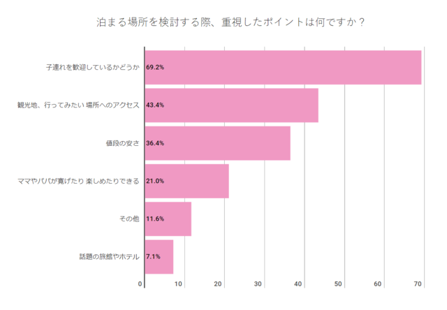 「値段の安さ」が3位と、家族が増えてからの旅行なためかコスパが重要な関心事であることもデータから読み取れます。