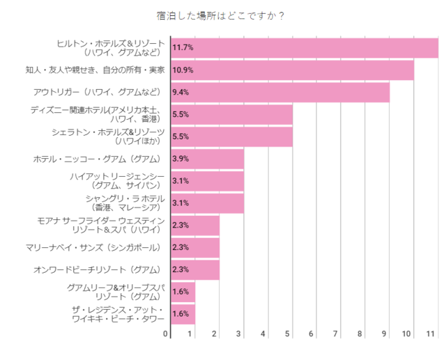 海外の宿泊場所で第1位になったのは、日本国内でもおなじみのヒルトンホテル。オアフ島やハワイ島、カウアイ島ほかハワイ各所や、グアムなど人気のビーチリゾートに展開するホテルグループとして、家族旅行での人気が明らかになりました。