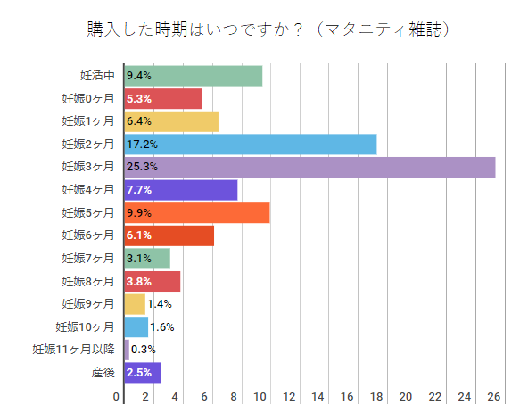 マタニティ雑誌を購入した方がもっとも多かったのは妊娠8~11週目にあたる妊娠3ヶ月でした。この時期といえば一般的にはつわりの症状がピークを迎え、心身ともに疲弊する時期なので意外?に思われるでしょうか。