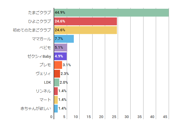 妊娠期、子育て期を分けずに「購入した雑誌」を尋ねたところ、このような順位で各雑誌が並びました。