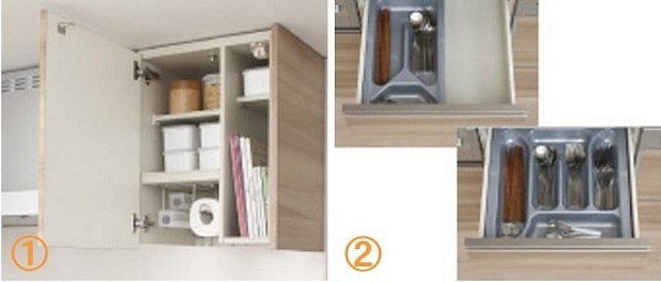 ① 上部吊戸棚にマルチハンガー:ラップなどが収納でき、キッチンペーパーは扉を開けず下部から取り出せます。棚板の位置を変えてレシピ本やまな板など高さがあるものも収まります。