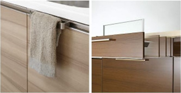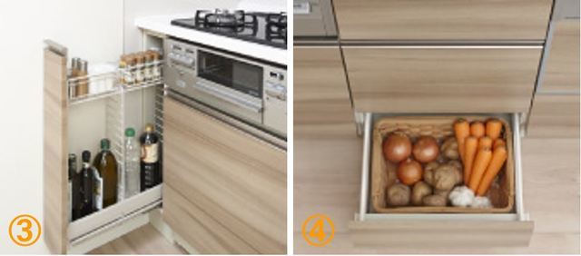② 機能的な引出し収納:作業スペース下に従来の約2倍のカトラリー類を(写真②)。コンロ下の引出しは、鍋などが取り出しやすく、高さのあるパスタ鍋もラクラク入ります。食洗器下は高さ17cmの500mm缶を縦置きで収められる引出しになっています。