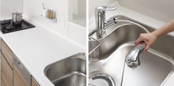 作業スペースの天板は人工大理石を使用しているので、傷がつきにくく、汚れにくく、お手入れも簡単。子どもが汚しても気にしなくて済みそうです。
