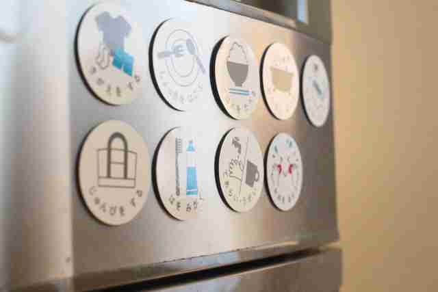 おしたくの意識付けとして活用できる「できたよマグネット」は、冷蔵庫やホワイトボードに貼ってそのまま使うことができる商品です。