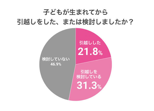 まずは、先輩ママパパに子どもが生まれた後に、引越しを検討したかどうか聞いてみたところ、約53%の人が「引越しした」または「検討している」という結果に。