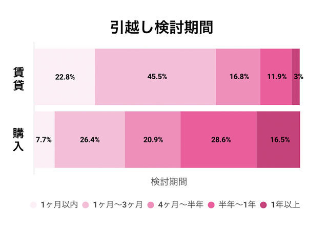 さらに、引越しをしたと答えた人へ、引越しするまでの検討期間を聞いてみると、見えてきたのは「購入」「賃貸」での大きな差。