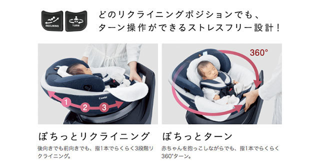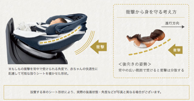 出典:www.combi.co.jp※もしもの衝撃を背中で受けられる角度で、赤ちゃんの快適性に配慮して可能な限りシートを寝かせた形状。設置する車のシート形状により、実際の装着状態・角度などが写真と異なる場合がございます。