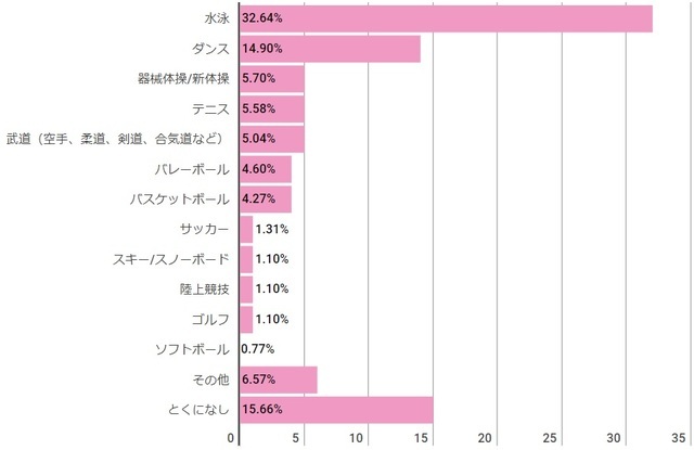男の子では6位、9位だった個人競技のダンス、器械体操/新体操がそれぞれ2位、3位と上位になっていることも女の子のランキングの特徴。きれいな姿勢、しなやかな動きで優美さを競うスポーツは、男の子よりも人気であることが明らかになりました。ダンスや体操は衣装やユニフォームへの憧れが女の子特有の理由としてあるかもしれませんね。