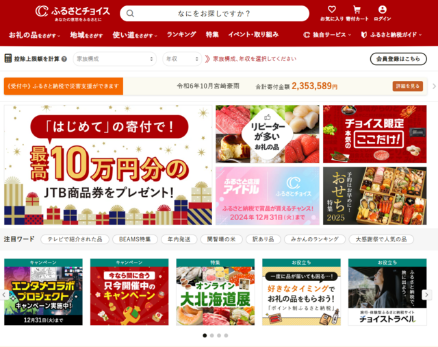 出典:www.furusato-tax.jp全国の自治体情報を網羅し、掲載返礼品数は50万点以上と選択肢の多さが特徴なのがふるさとチョイスです。