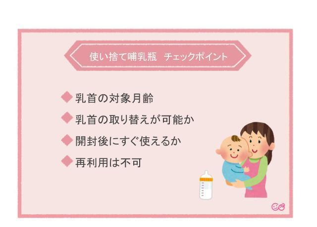 ほとんどの使い捨て哺乳瓶には、乳首もセットになっています。使い捨て哺乳瓶を選ぶ際は、普通の哺乳瓶と同様に乳首の対象月齢をチェックが必要です。