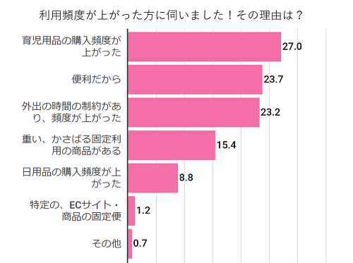 子育て世帯の宅配サービス利用が上がる理由は、便利さの23%よりも、育児用品の購入が27%と1位に。さらに、外出時間の制約が23%、重い・かさばるものの購入という答えは、15%となっていて、先の1位とあわせると、65%以上が、子育て世帯ならではの利用理由だといえます。
