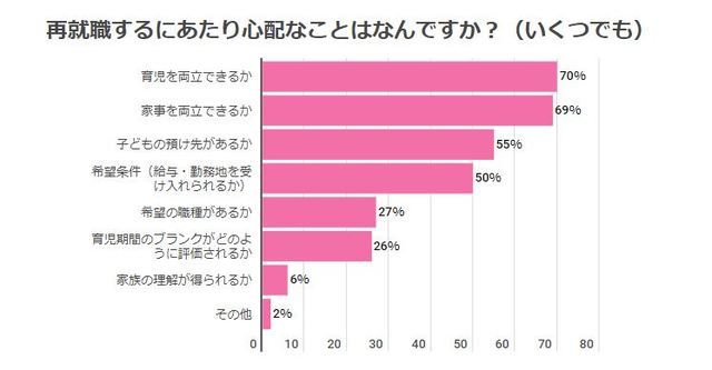 ママたちの再就職には「子育てや家事を両立できる時間帯や勤務時間で働けること」「再就職しやすい職種であること」「家や子どもを預ける場所から近いこと」が大切であることがわかりました。