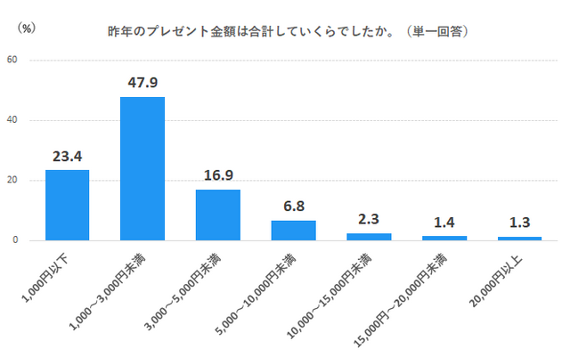 昨年のバレンタインデーにかけたプレゼント(物)の金額も、1,000~3,000円未満の方が47%と最多。子どもが小さいうちは、子どもの行事もあり、さまざまな出費が重なるため、パパへのバレンタインデー用の支出は抑え気味になる傾向があるようです。