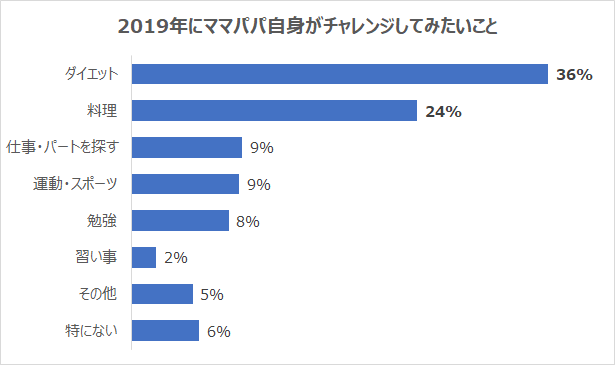 「2019年にママパパがチャレンジしたいこと」を伺ったところ、第1位が「ダイエット」で36%、第2位が「料理」で24%、第3位が「仕事・パートを探す」と「運動・スポーツ」で9%という結果になりました。