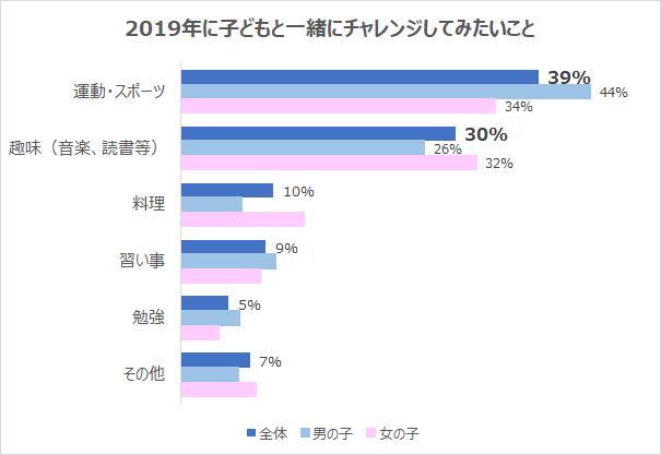 「2019年に子どもと一緒にチャレンジしたいこと」を伺ったところ、第1位が「運動・スポーツ」で39%、第2位が「趣味(音楽、読書等)」で30%、第3位が「料理」で9%という結果になりました。