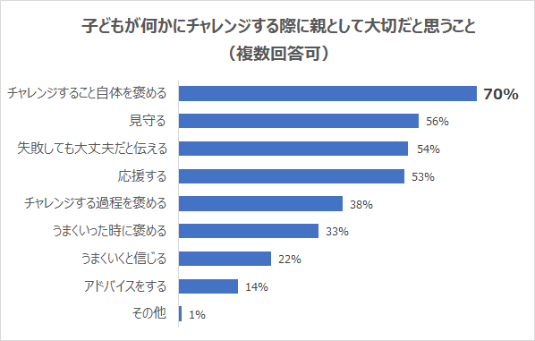 「子どもが何かにチャレンジする際に親として大切だと思うこと」を伺ったところ、第1位が「チャレンジすること自体を褒める」で70%、第2位が「見守る」で56%、第3位が「失敗しても大丈夫だと伝える」で54%という結果になりました。