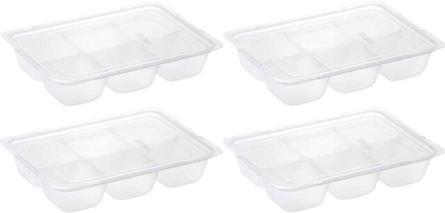 製氷皿とシリコンカップ、シリコンカップが入る小分けされたタッパー。いずれも離乳食用のため、100均で揃えました。