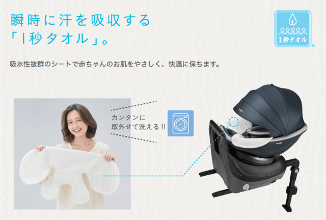 出典:www.combi.co.jpそれでも汗をかいてしまったら、吸水性抜群の1秒タオルを採用したシートがサッと汗を吸収してくれますよ!