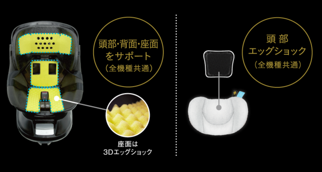 そこで「クルムーヴ スマート」には、コンビ独自の超・衝撃吸収素材「エッグショック」を頭部や背面、座面に広く搭載!