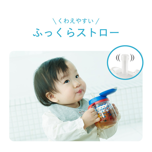 先がまるくなった「ふっくらストロー」は、くわえやすい新形状で赤ちゃんのトレーニングをやさしくサポート。