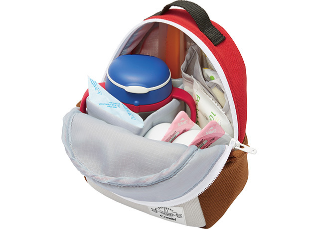 コンビの新商品「2ウェイマグポーチリュック」は、便利な間仕切り付きで、マグを離乳食などと一緒にスッキリたっぷり収納できます。保冷剤用のポケットが付いているのもポイントです。